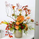 2025/10/13~10/18のお花 ・チカラシバ ・カンガルーポー ・マリーゴールド ・リコリス ・アンスリューム ・ファスティギアータ ・ピンクッション ・バラ ・紅葉ヒペリカム ・ガーベラ ・クラスペディア ・銀…