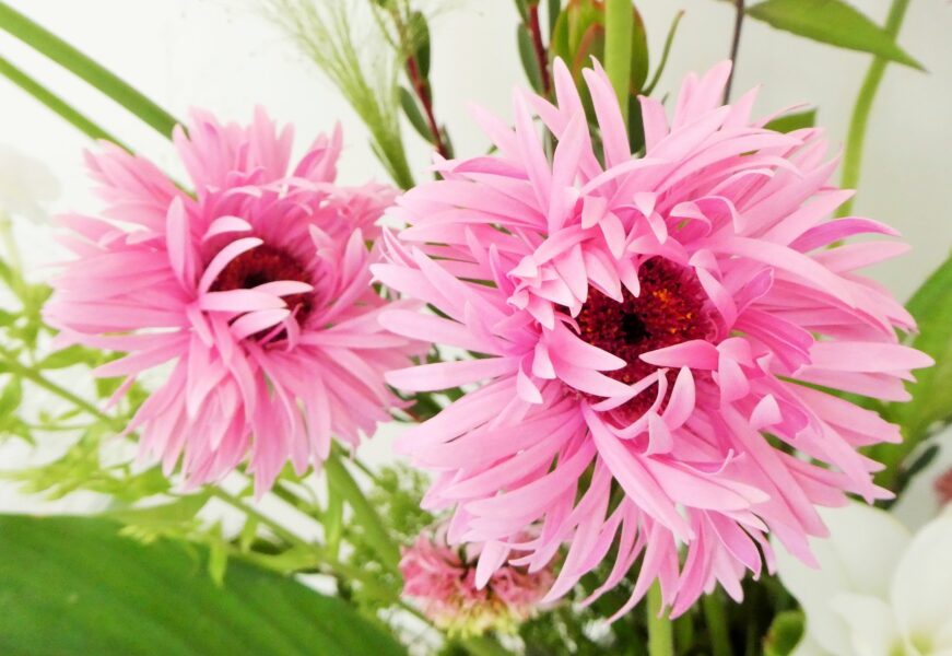 ちなみにピンクのガーベラの花言葉は「前進」ですっきり伸びた長い茎と気持ちが明るくなるピンクの色合いが合わさっていることで新しい門出を迎える方へのお祝いの花として向いているそうです🥰