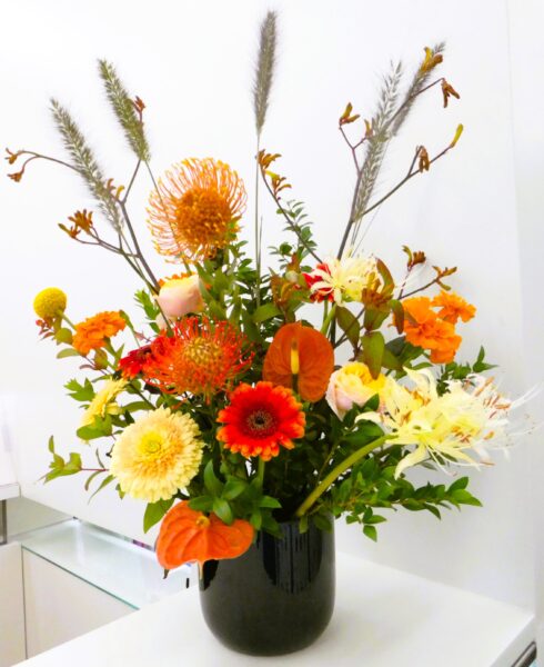 今週は黄色とオレンジが主体で秋の深まりを感じさせるアレンジになっています🍂