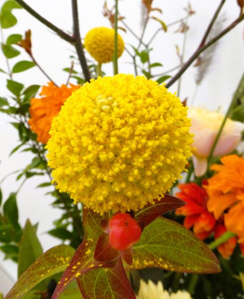 丸い黄色の花が印象的なクラスペディアは、別名「ドラムスティック」。見た目のとおりコロンとした形で、アレンジの中でも目を引く存在です。性格診断にたとえるなら…