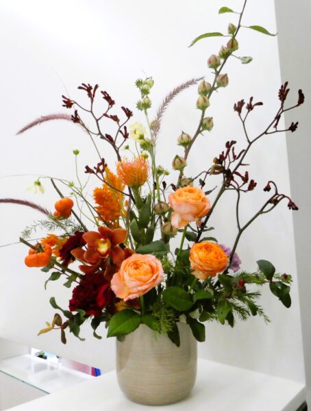 バラのオレンジを真ん中に、カーネーションやカンガルーポーの深い赤が印象的です😳