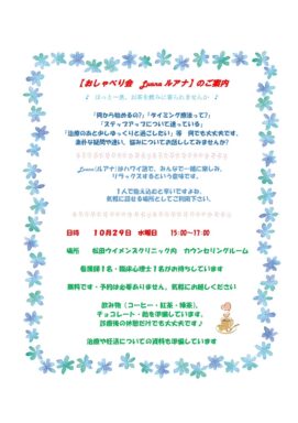 15時〜17時の間、当院カウンセリングルームで看護師と心理士がお待ちしておりますので、どなたでもご自由に参加出来る会となっております。