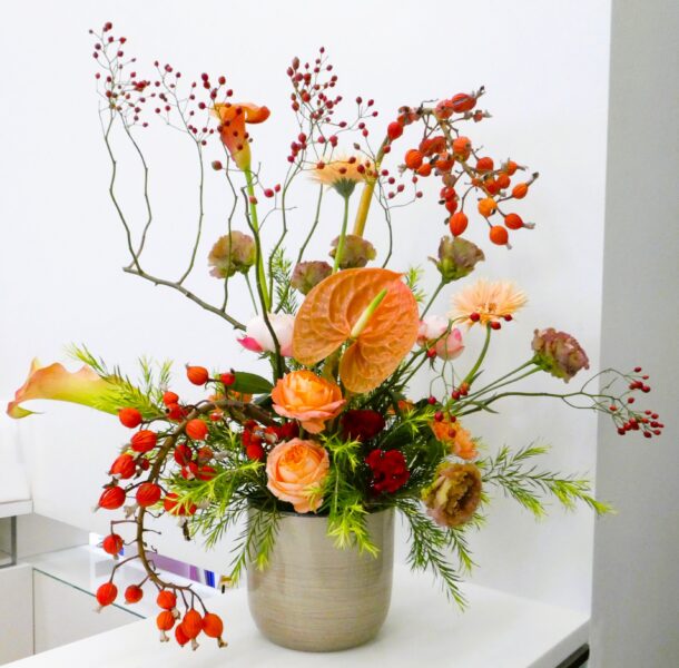 明るいオレンジのバラとアンスリュームを中心に赤い色合いが周りを飾っている感じですね✨