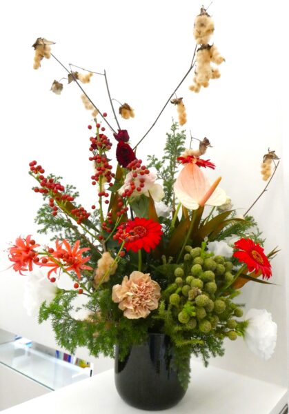 バーゼリアの緑のつぼみとアメリカンホーリーの赤い実がクリスマスの雰囲気を出してくれています🎅