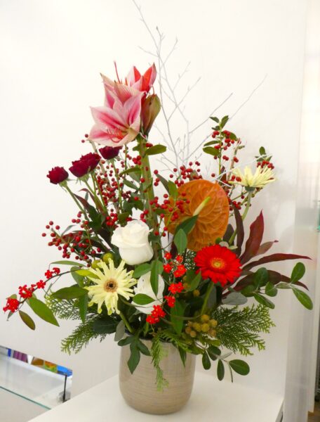 今週もクリスマスカラー🎄がメインですがそれに白やクリーム色のアクセントが映えているアレンジになります✨