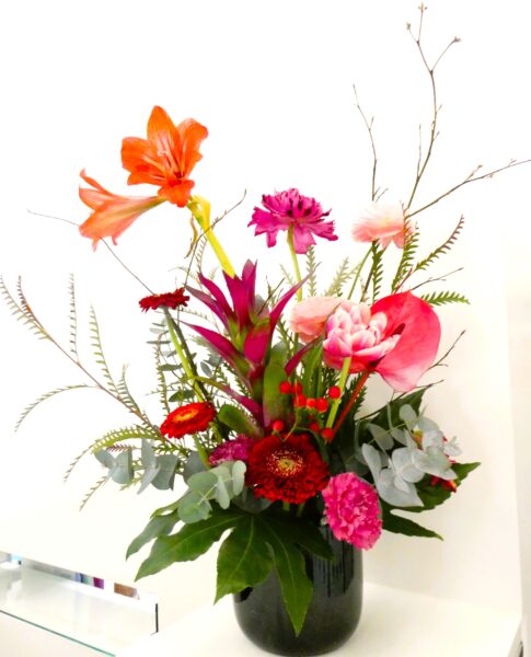 今週は鮮やかな赤やピンクが目立ち、葉物の緑も多い見ごたえのあるアレンジになっています✨