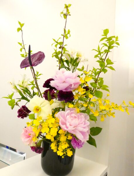アンスリュームやカーネーションの深い紫が大人っぽい印象です🍷
